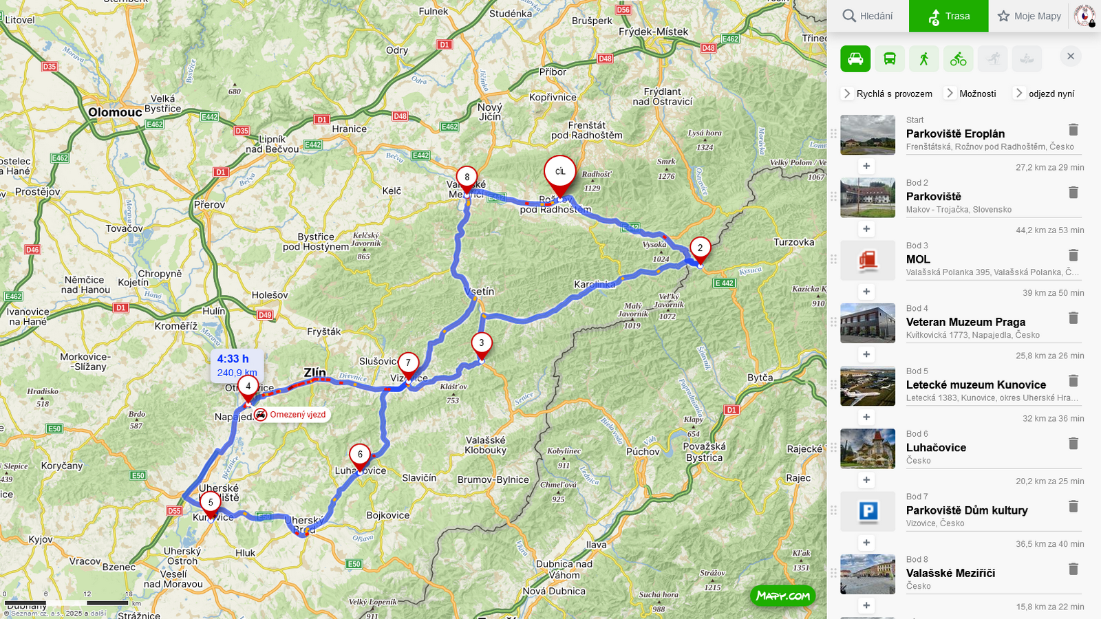 cca 16:30 Odjezd CZ účastníků směr Uherský Brod, Luhačovice, Vizovice, Vsetín, Valašské Meziříčí, parkoviště Hotelu Eroplán STOP rozloučení s posledními účastníky